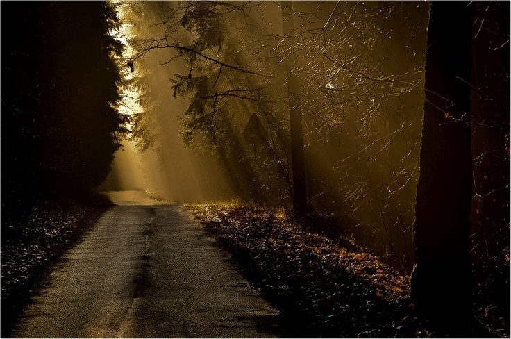 Listopadowe słońce i mgła w Puszczy Augustowskiej.