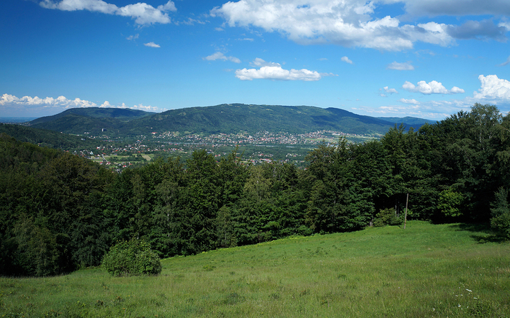 Meszna. Widok z Chaty na Groniu na Beskid Mały.