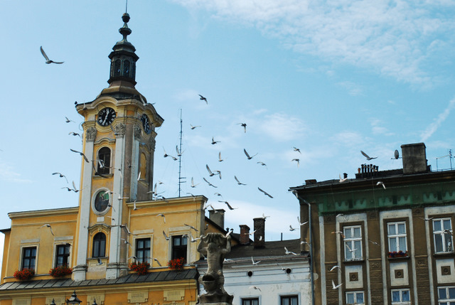 Gołębie na rynku skoczowskim.