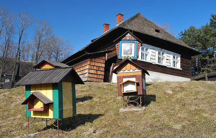 Fragment skansenu przy zabytkowej Izbie Regionalnej w Starej Wsi kWilamowic.