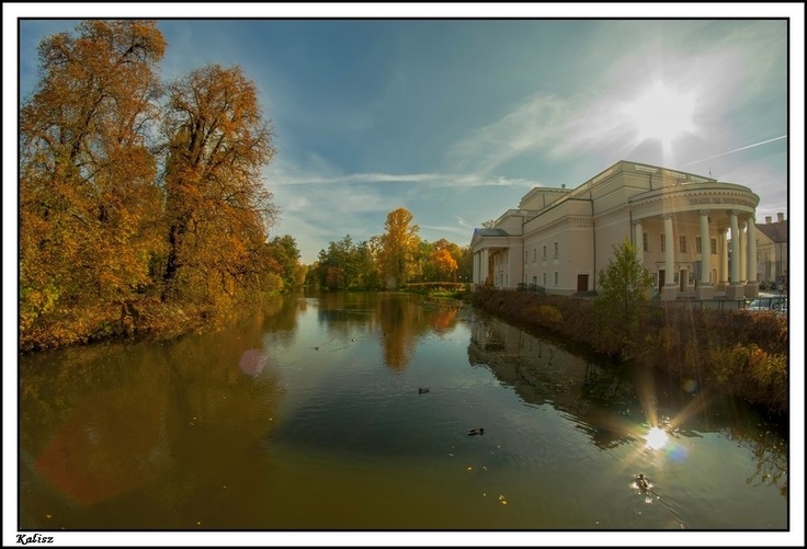 piękne jesienne zdjęcie i jedno z najładniejszych miejsc w Kaliszu, słoneczko, drzewa w złoto ubrane i teatr i w Prośnie się przeglądają a niebo patrzy błękitem
