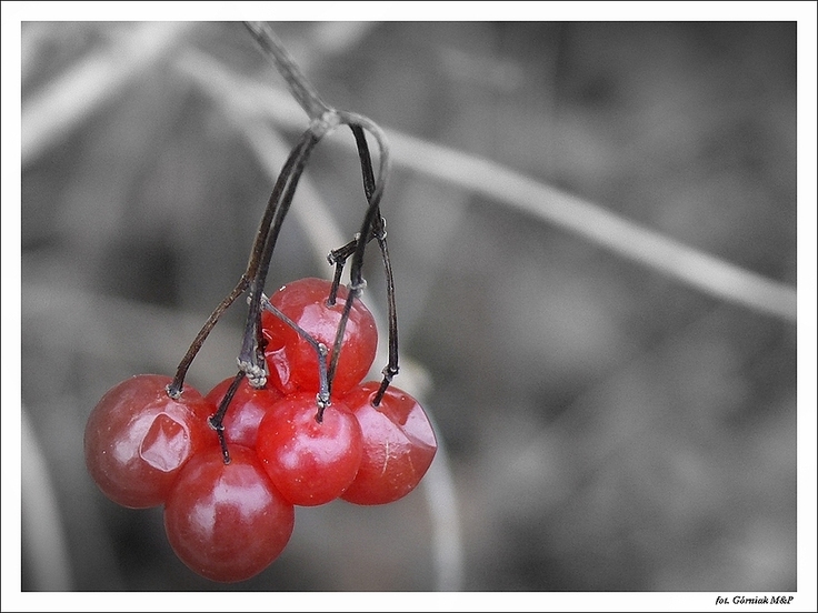 Elu, dziękuję za komentarz, a ta roślinka to Kalina koralowa (Viburnum opulus) Krzew o niezwykle ozdobnych, wiszących do dołu owocach w kolorze czerwonym lub żółtym, pojawiających się już w sierpniu. Owoce te zawierają garbniki, są więc niechętnie zjadane przez ptaki. Pozostają więc na krzewach aż do wiosny. Są bardzo dekoracyjne i lśniące. Pozdrawiam serdecznie :))