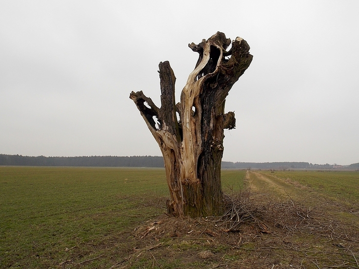 Aż nie chce się patrzeć na \"ogoloną\" samotną wierzbę na polu w Szczypiornie. Ścieżką przy tej wierzbie wielokrotnie spacerowałam, wielokrotnie tą piękną wierzbę fotografowałam i podziwiałam. W zeszłym roku jeden duży konar wierzby przewrócił wiatr a środek ktoś wypalił. Teraz ścięto z niej wszystkie gałęzie. Samotna, nieszczęśliwa straszy wieczorem na szczypiorniańskich polach.