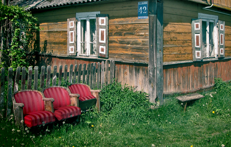 Wsie na Podlasiu mają szczególny koloryt. Przede wszystkim większość starych domostw jest drewniana, podobnie zresztą jak ich ogrodzenia. Nie uświadczymy tu wystawnych murowanych płotów, nawet zwykłe metalowe siatki należą do rzadkości. Do tego dochodzi często brukowana droga prowadząca przez wieś. A przed domami, przy ścianie budynku lub oparte plecami o przekrzywiony płot, obowiązkowe ławeczki, do przesiadywania w niedzielne popołudnia i kontemplowania otaczającego pięknego świata. Nieraz owe „przyzby” przybierają barokowe, przedziwne wręcz formy, jak na zdjęciu powyżej...