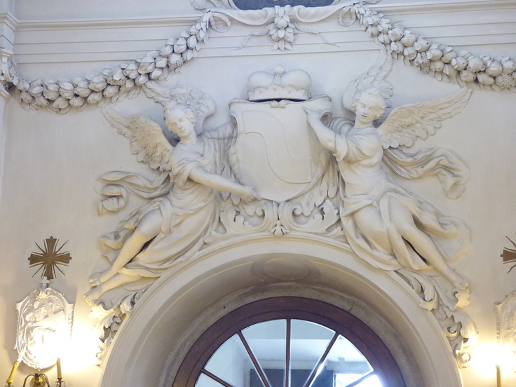 Herb Lubomirskich ,,Szreniawa,, nad wejściem do kościoła.