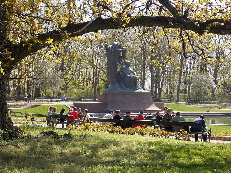 Warszawa. W słoneczny dzień przed pomnikiem Chopina.