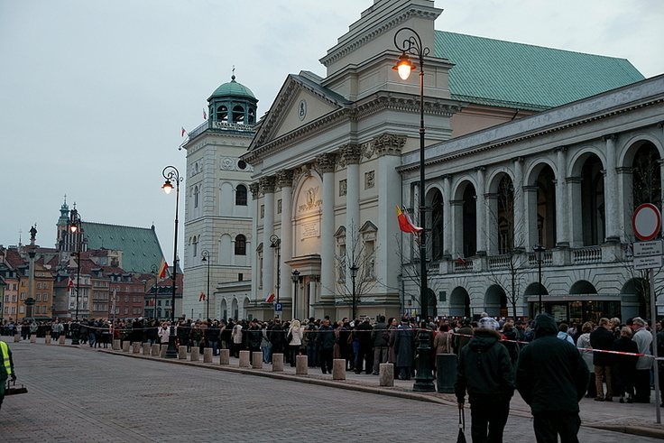 Krakowskie Przedmieście 14 kwietnia w kolejce do trumien Pary Prezydenckiej.