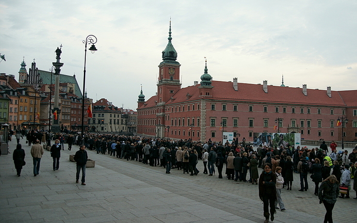 Krakowskie Przedmieście, poranek 14 kwietnia w kolejce do trumien Pary Prezydenckiej.