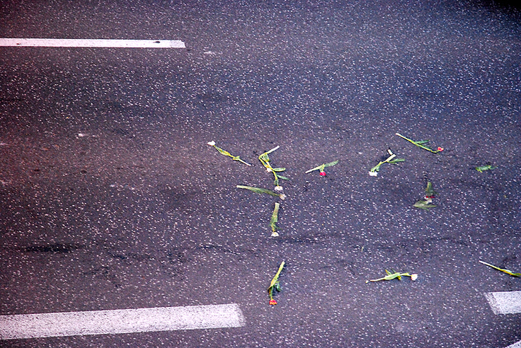 Warszawa 15 kwietnia 2010, Trasa Łazienkowska. Kwiaty rzucone w żałobny kondukt z ciałami 34 ofiar katastrofy pod Smoleńskiem