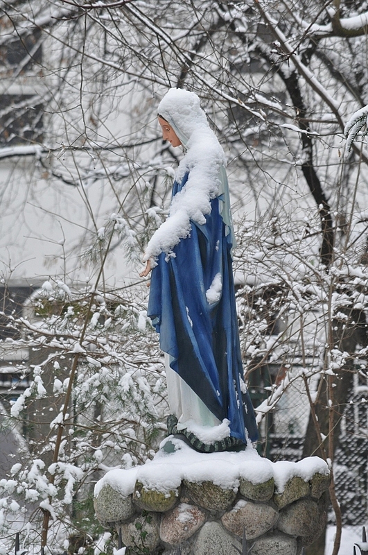 Figura NMP w ogrodzie domu na Starówce. Warszawa