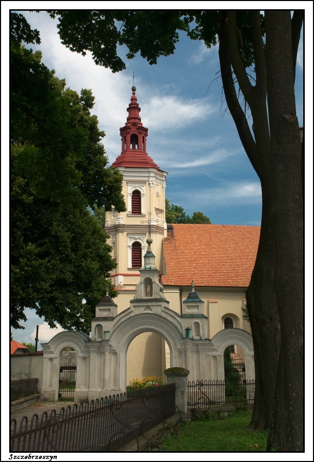 Kościół murowany z kamienia i cegły, trzynawowy, w stylu renesansu lubelskiego, przy prezbiterium zakrystia, w środku bocznych naw 2 kaplice renesansowe, wybudowane razem z kościołem, na frontonie wieża z kruchtą w przyziemiu, nad nawą wieżyczka na sygnaturkę. Do kościoła prowadzi barokowa brama z XVIII w.