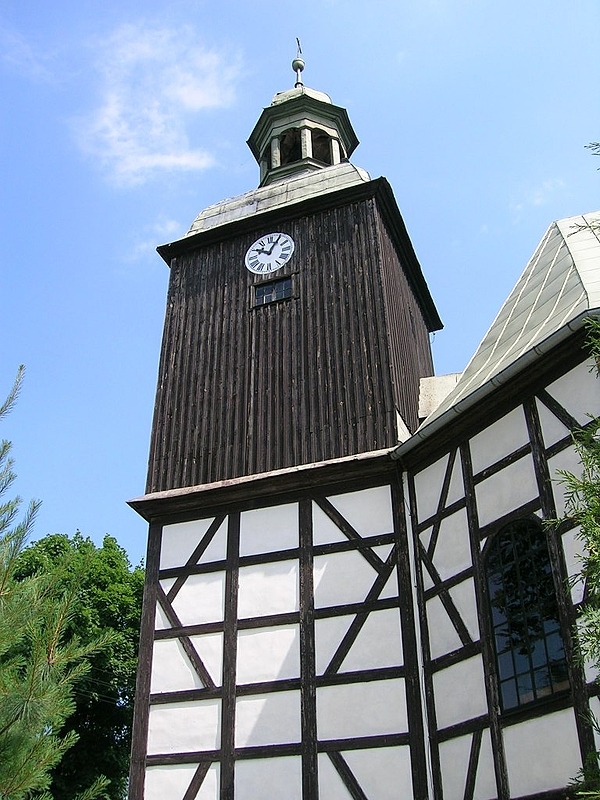 Drewniano-szachulcowy kościół w Boguszycach z zegarem z 1899r.