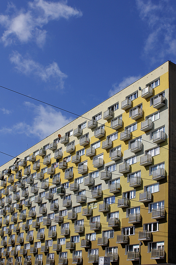 Latem ok.godziny dziewiątej gdy jest bezchmurne niebo i słońce wzniesie się ponad dachy, na tym budynku od strony CH Batory jest wspaniała mozaika utworzona przez ostre cienie balkonów.W miarę upływu minut cienie zmieniają kształt ; fantastycznie to wygląda.....:))
