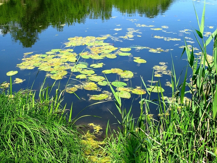 Na tym stawie (na zdjęciu) co roku pojawiają się nenufary. Na razie jeszcze nie ma kwiatów, ale liście już pokrywają taflę wody. Unoszą się na powierzchni dzięki licznym komorom powietrznym w blaszce liściowej i ogonku, a także za sprawą śluzu wydzielanego przez włoski gęsto pokrywające spód liścia.