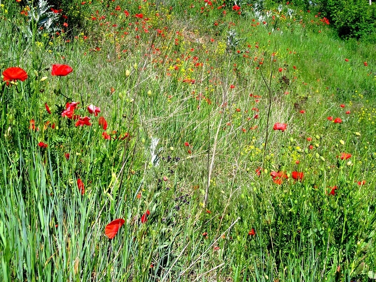 Ten wzgórek porośnięty trawą (na zdjęciu), pokrył się w tym roku czerwonym dywanem makowym. Szkoda, że maki nie mają długiego żywota.