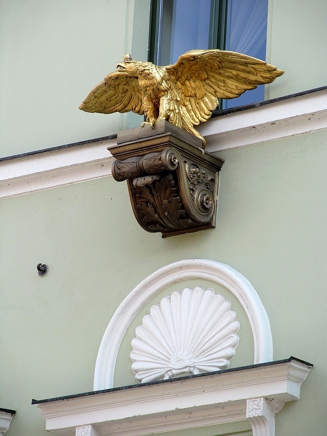 Ten orzeł w kolorze złota (na zdjęciu) zdobi kamienicę z XV wieku, przebudowaną w stylu klasycystycznym około 1830 r., stojącą przy Rynku Staromiejskim w Toruniu. Gdy w XIV wieku z Wrocławia przybył tu aptekarz o imieniu Arnold, właśnie w tej kamienicy założył swoją aptekę. W 1652 r. w drodze przywileju, apteka otrzymała nazwę APTEKA KRÓLEWSKA. Orzeł, jaki do dziś znajduje się nad wejściem, umieszczony został dopiero w XIX wieku, ale od tego czasu jest to APTEKA POD ORŁEM. Więcej na temat tej apteki można dowiedzieć się z artykułu pt. Toruńskie aptek, czyli średniowieczne aptekarstwo w Toruniu i jego pierwsze apteki, jaki opublikowałem w ekskluzywnym miesięczniku krajoznawczo-turystycznym POZNAJ SWÓJ KRAJ (nr 1-3/2017). Polecam tę lekturę.