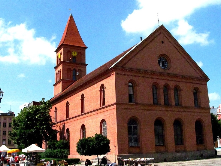 Protestanci z Nowego Miasta Toruń, pozbawieni swojej świątyni, w 1668 r. przekształcili niewykorzystywany już obiekt dawnego Ratusza na zbór pw. Świętej Trójcy (Dreifaltigkeitskirche), który użytkowany był do 1818 r. Wówczas ze względu na bardzo zły stan techniczny został rozebrany, ale już 6 lat później, w tym samym miejscu, ukończono budowę nowego w stylu arkadowym, z klasycystycznym wnętrzem. Był to projekt dostarczony przez niemiecką Wyższą Deputację Budowlaną, a opracowany prawdopodobnie z dużym udziałem Karla (Carla) Friedricha Schinkla  niemieckiego architekta i urbanisty (był on także malarzem), jednego z najwybitniejszych twórców klasycyzmu w Królestwie Prus. Na zdjęciu: Obiekt stojący pośrodku Rynku Nowomiejskiego w Toruniu, który był wcześniej Ratuszem, potem zborem ewangelickim, a obecnie siedzibą prywatnej fundacji TUMULT.