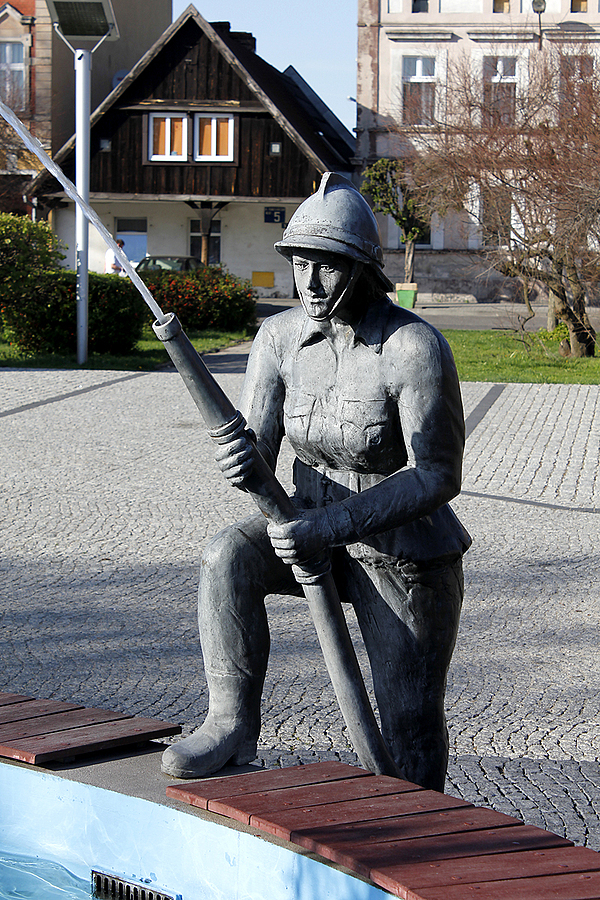 Rakoniewice - fontanna ze strażakami na Placu Powstańców Wielkopolskich
