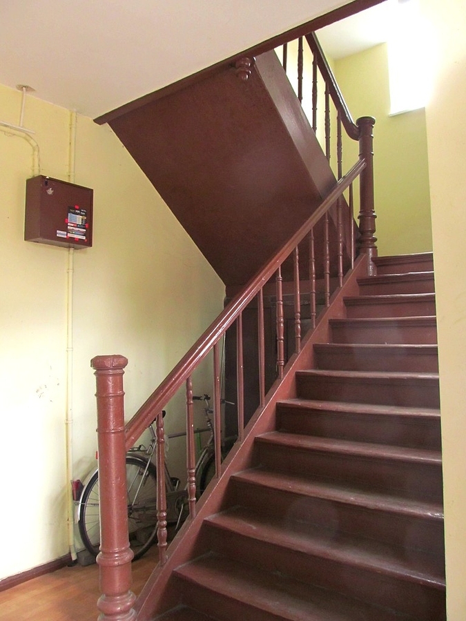 Na zdjęciu: Drewniane schody na piętro w byłej bibliotece.