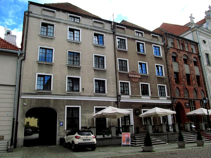 10 lutego 1937 roku w Warszawie, z inicjatywy Związku Młodzieży Wiejskiej \"Wici\", Związku Zawodowego Pracowników Spółdzielczych, Spółdzielczości Rolniczej i Organizacji Rolniczych, powołano do życia Spółdzielnię Turystyczno-Wypoczynkową GROMADA, czyli pierwsze w kraju chłopskie biuro podróży. Wówczas chyba mało kto wierzył w to, że rozrośnie się do wielkiej ogólnokrajowej spółdzielni i przetrwa 85 lat, a nic nie wskazuje na to, aby nastąpiło rychłe zakończenie jej działalności. W Toruniu, jako restauracja ZAJAZD STAROPOLSKI i hotel GROMADA mieści się przy ul. Żeglarskiej, zaledwie kilkadziesiąt metrów od średniowiecznej bramy miejskiej, przez którą dawno temu wprowadzano do miasta przybyłych z zewnątrz największych dostojników, a ul. Żeglarską (wtedy Via Regia, czyli Drogą Królewską), w uroczystym przemarszu prowadzono gości do Ratusza. Na zdjęciu: Trzy kamienice należące do hotelu GROMADA i restauracji ZAJAZD STAROPOLSKI.