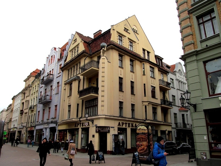 Na zdjęciu: Apteka Radziecka stojąca na rogu ul. Szerokiej i Łaziennej w Toruniu, która po likwidacji w 2011 roku Apteki Królewskiej, czyli Pod Orłem na Rynku Staromiejskim, była najstarszą toruńską apteką, założoną w 1623 roku z inicjatywy Rady Miejskiej (stąd wzięła się jej nazwa). Jej godłem była płaskorzeźba herbu Torunia, a król polski Jan Kazimierz w 1649 roku potwierdził przywileje jej nadane. Niestety, i tak apteka w 2019 roku została zlikwidowana.