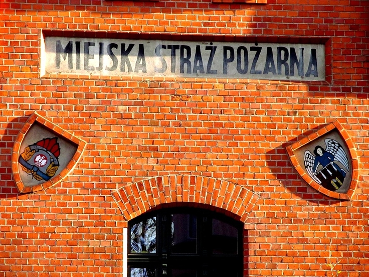 Na zdjęciu: Dwa herby: strażaków i miasta na budynku z początku XX wieku.