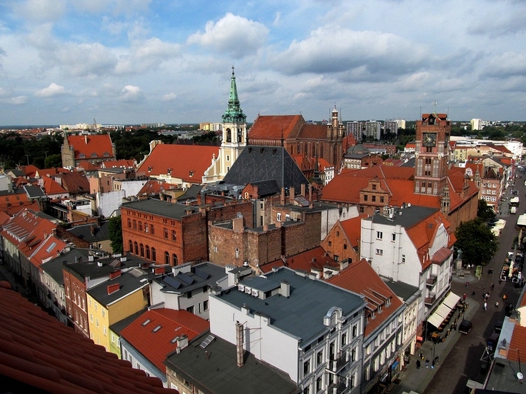 Toruń  to miasto (po Krakowie), które posiada największą ilość gotyckiej architektury ceglanej, w dodatku najlepiej zachowanej po dzień dzisiejszy, jaką można zobaczyć jeszcze w Europie Północnej. Posiada 6 zabytków klasy zerowej, 50  klasy pierwszej oraz 270 klasy drugiej. Ślady przeszłości, jakie można natrafić w centrum Torunia niemal na każdym kroku, upoważnia to miasto do tego, aby używało hasła \"Gotyk na dotyk\". I takim właśnie hasłem posługuje się już od wielu lat. Na zdjęciu: Toruńska starówka widziana z wieży kościoła św. św. Janów; na zdjęciu widać wyraźnie ratuszową wieżę z zegarem (z prawej), białą dzwonnicę kościoła św. Ducha (z lewej), a w głębi zdjęcia  trzy sterczyny kościoła pw. Wniebowzięcia NMP.
