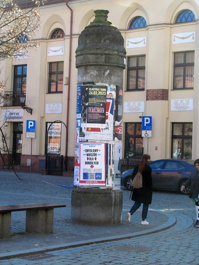 Najstarsze słupy ogłoszeniowe w Toruniu (a jest ich jeszcze kilka), pamiętają przełom XIX i XX wieku, ale dziś nikt się nawet nie zastanawia nad tym, skąd się wzięła moda na stawianie tego rodzaju słupów (dawniej betonowych, obecnie metalowych) o kształcie walca w newralgicznych miejscach miasta, najczęściej na rogach ulic i w taki sposób, aby nie można było ich przegapić. Często pełniły podwójną rolę  w ich wnętrzu lokowano małe kioski z gazetami i innymi drobnymi artykułami, albo pełniły funkcję składziku na miotły i szczotki dla osób sprzątających ulice. Słupy te wymyślił w 1854 roku berliński drukarz  Ernst Litfaß, który szukał jakiegoś skutecznego rozwiązania problemu z rozlepianiem afiszów byle gdzie. Wynalazek ten bardzo szybko rozpowszechnił się i przyjął nazwę Kolumny Litfaßsa lub Litfaßsäule (słupek reklamowy)  nazwa pochodzi od nazwiska wynalazcy. Na zdjęciu: Stary i betonowy słup reklamowy na Rynku Nowomiejskim, stojący po dzień dzisiejszy  jeden z nielicznych, jakie się zachowały.