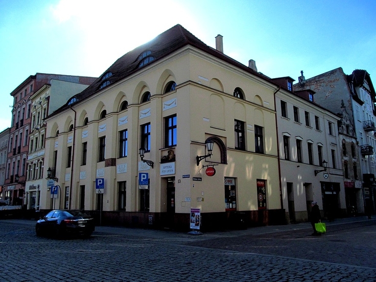 Najstarszą obecnie i czynną po dzień dzisiejszy apteką w Toruniu jest niewątpliwie ta stojąca przy Rynku Nowomiejskim 13 (róg ul. Królowej Jadwigi), która powstała jeszcze w XIV wieku  to apteka POD ZŁOTYM LWEM. Ale farmacja i aptekarstwo w tym mieście mają swoje początki już w średniowieczu, a dokładniej w XIII wieku. Bo trzeba wiedzieć, że od czasów średniowiecza nie było drugiego miasta w Polsce, którego życie gospodarcze byłoby bardziej uwarunkowane od sytuacji politycznej. Położenie geopolityczne Torunia miało na ten stan znaczący wpływ, a miasto dotkliwie odczuwało każdy spór Zakonu z Polską; i choć doznawało wielu korzyści i dobrodziejstw wypływających z pokoju, to długie działania wojenne pomiędzy Zakonem a Polską prowadziły do jego upadku i zniszczeń. Duży wpływ na rozwój aptekarstwa miały wówczas przywileje królewskie, akty prawne oraz decyzje podejmowane przez Radę Miejską. W 1623 roku instytucja ta wydała ważny dla aptekarzy dokument, tzw. Ordynację Aptekarską. Wieloletnia niewola państwa polskiego i dwie wojny światowe nie pozwoliły na normalny rozwój aptekarstwa toruńskiego; obowiązywały tu przepisy prawne nadane przez władze pruskie, do których każdy aptekarz musiał się dostosować. Przyczyniło się to do zahamowania rozwoju aptekarstwa na terenach okupowanych przez Prusy. Ale apteka POD ZŁOTYM LWEM nie była pierwszą, jaka powstała w tym mieście  dwie starsze przestały funkcjonować w XXI wieku, a o innych, znacznie mniejszych, niewielu torunian nawet wie, że takie istniały na terenie Torunia. Na zdjęciu: Apteka POD ZŁOTYM LWEM widziana od strony ul. Prostej.