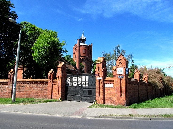 Na zdjęciu: Narożnik ogrodzenia i główna brama wjazdowa na teren Wodociągów przy ul. św. Józefa w Toruniu.