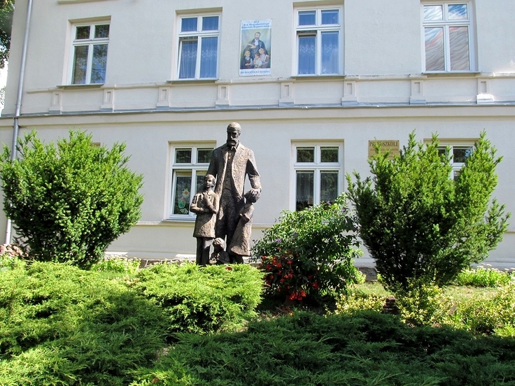 Na rogu dzisiejszej ulicy Wojska Polskiego i Szkolnej w Aleksandrowie Kujawskim stoi budynek z bogatą historią. Gdy ulica nazywała się Wilsona była tu prywatna szkoła Emilii Hankowej. W szkole zajęcia plastyczne prowadził Władysław Bębnowski miejscowy rzeźbiarz, a placówka funkcjonowała do 1923 r., bo już od 1930 r. była to prywatna szkoła powszechna na stosunkowo wysokim poziomie prowadzona przez Zgromadzenie Sióstr Niepokalanego Poczęcia NMP. Ta elitarna szkoła dla grupy około 60 uczniów, jeszcze do 1939 r. uzyskała status pełnej szkoły 7-klasowej. Od września tego roku zamieszkał tu błogosławiony ksiądz dr Edward Grzymała (dziś jest patronem miasta). Został on aresztowany przez gestapo 26 sierpnia 1940 r. i wywieziony do Dachau, gdzie zginął 10 sierpnia 1942 r. Zamieszczona (od strony ul. Szkolnej) w 2011 r. na budynku tablica pamiątkowa, informuje o tym fakcie. Patronem przedszkola jest działacz społeczny, twórca ochronek wiejskich i założyciel Zgromadzenie Sióstr Służebniczek NMP Edmund Bojanowski. Papież Jan Paweł II zaliczył go (13.06.1999 r.) do grona błogosławionych. Na zdjęciu: Pomnik błogosławionego w otoczeniu dziewczynek stoi przed budynkiem przedszkola od strony ul. Wojska Polskiego.
