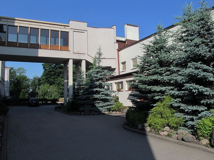 Ten łącznik (na zdjęciu) łączy halę sportową (na zdjęciu z prawej strony) pobudowanej na tyłach dziedzińca salezjańskiego z gmachem salezjańskiej szkoły (ledwo widocznej na zdjęciu z lewej strony) w Aleksandrowie Kujawskim.