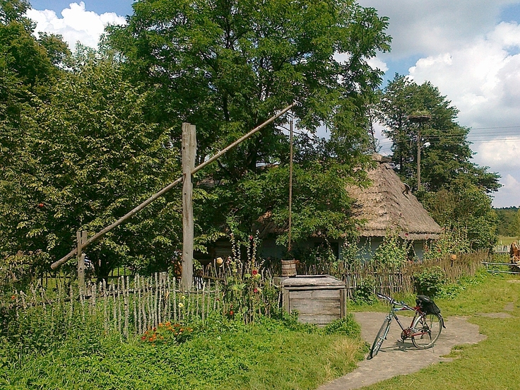 ślicznie tutaj z malwami, z płotem , z żurawiem (a rowerek pewnie Twój )