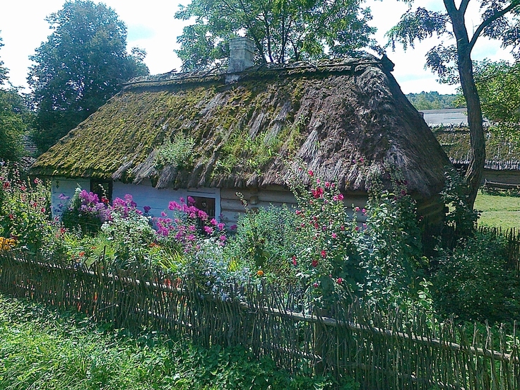 urokliwie w tym kadrze- chata, płocik, malwy - sielski klimat