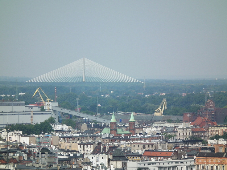 panorama Wrocławia w tle most Rędziński-drogowy most wantowy nad Odrą