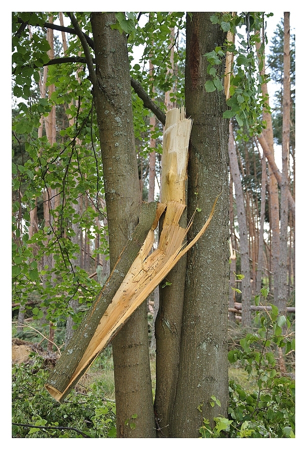 Skutki przejścia trąby powietrznej na linii Zdroje - Trzebciny - Łążek - Stara Rzeka. Prezentowane zdjęcia zostały zrobione 16.07.2012 r. pomiędzy Trzebcinami a Łążkiem.