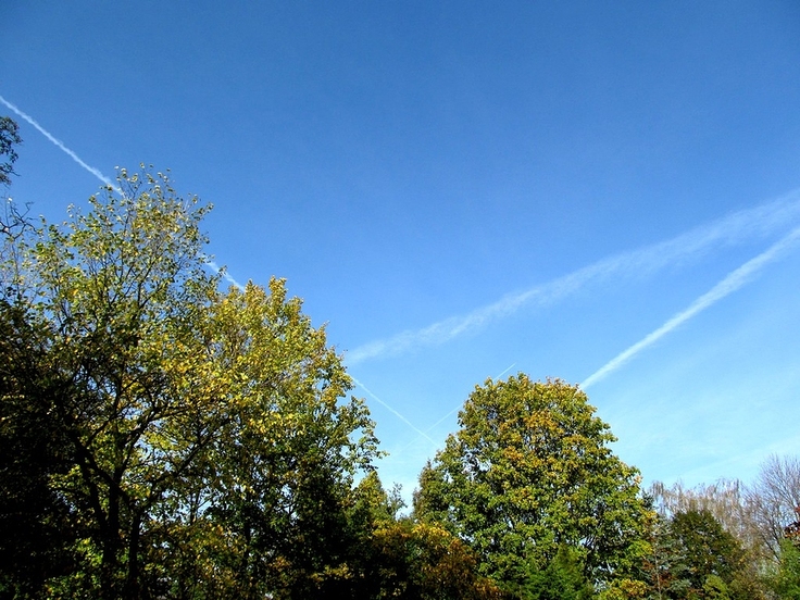 Taki obrazek zarejestrowałem na jesiennym niebie będąc w Aleksandrowie Kujawskim. Tam też przelatujące samoloty za sobą pozostawiają białe smugi.