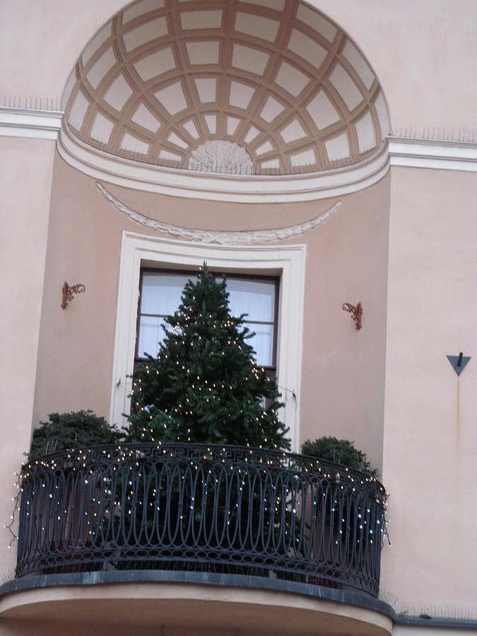Balkon I piętra Domu Harcerza - kamienicy stojącej przy południowej pierzei Rynku Staromiejskiego w Toruniu, na okres zimowych świąt, wypełniła choinka; niebawem zniknie z balkonu.