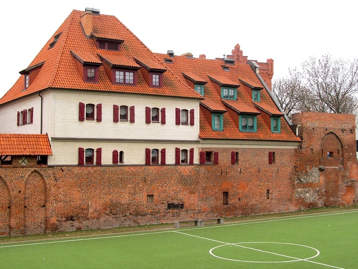 Ten biały budynek na zdjęciu  to obecnie hotel. W średniowieczu był t o młyn wodny zbudowany przez Krzyżaków. Natomiast to zielone boisko przed murem obronnym  w XIII wieku było fosą, a właściwie stawem rybnym, nazywanym Stawem Komtura.