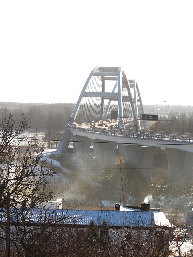 Zimowa mgła i dymy z kominów domów mieszkalnych, stojących nieopodal mostu im. gen. Elżbiety Zawackiej w Toruniu, przysłaniają nieco tę współczesną przeprawę przez Wisłę.