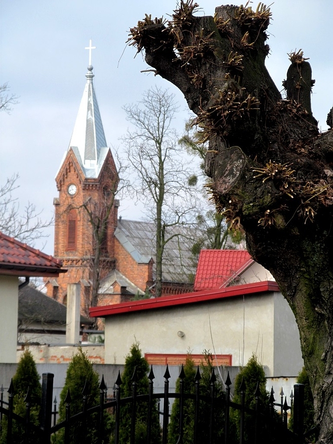 Te dwie wieże (na zdjęciu) oddalone są od siebie o kilkadziesiąt metrów. Ta na pierwszym planie to drzewo z poobcinanymi gałęziami już chyba nigdy nie powróci do życia; wieża w głębi zdjęcia należy do kościoła pw. Przemienienia Pańskiego pierwszego kościoła, jaki pobudowano w Aleksandrowie Kujawskim.