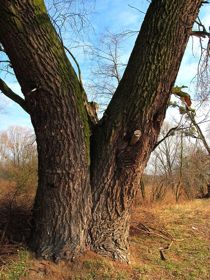 Na dzikich terenach w Aleksandrowie Kujawskim rosną pokaźne drzewa, jak ten bliźniak (na zdjęciu).