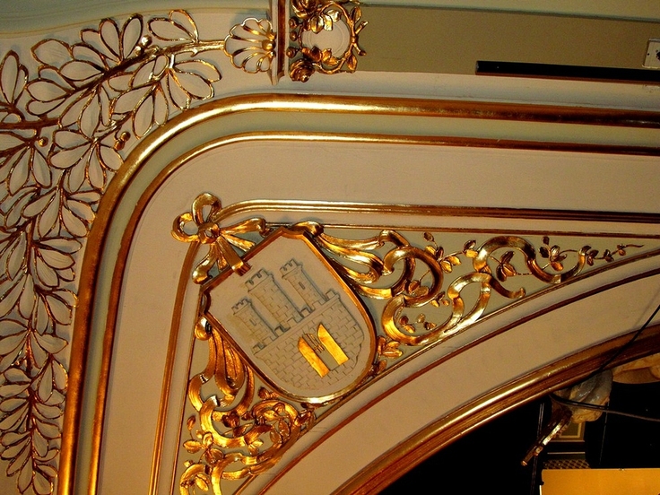 Ten herb Torunia (na zdjęciu) widnieje na pięknym złoconym obramowaniu dużej sceny Teatru im. Wilama Horzycy.