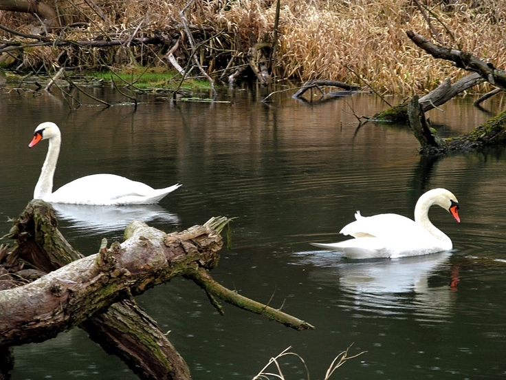 Mój wiosenny spacer zaowocował wiosennymi ujęciami przyrody. Na stawie w pobliżu koryta Wisły w Toruniu zauważyłem parę białych łabędzi (na zdjęciu).