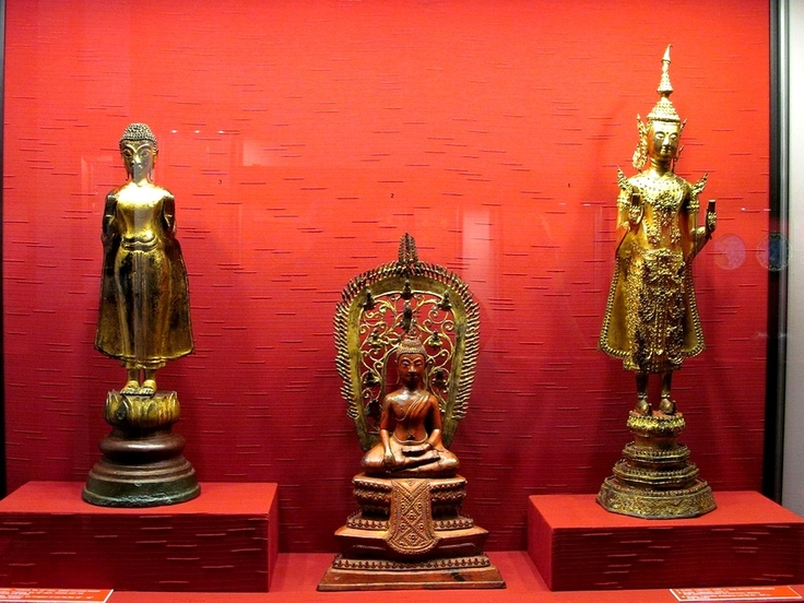 Na prezentowanej fotografii są trzy Buddy z Tajlandii: ten po lewej pochodzi z XVIII w. i jest to złocony i inkrustowany brąz; ten z prawej pochodzi z przełomu XV i XVI w. i jest to złocony brąz, a oznacza Królestwo Lan Na, czyli królestwo miliona pól ryżowych, a więc oznacza dawne królestwo położone na terenie obecnej Tajlandii; ten po środku natomiast to złocony brąz polichromowy na czerwono z XVIII w.