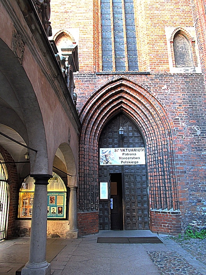 Bezpośrednio z ulicy Marii Panny w Toruniu, przez jedną z dwóch metalowych furt zamocowanych w murowanym ogrodzeniu, można wejść na krużganek, a przechodząc nim wzdłuż w kierunku świątyni - wejść do kościoła pw. Wniebowzięcia Najświętszej Marii Panny przez duże i ozdobne wrota z drewna (na zdjęciu). To w tym kościele od 1 lipca 1938 r. do 18 października roku następnego, swoją posługę kapłańską, jako wikariusz, pełnił ks. Stefan Wincenty Frelichowski; aresztowany przez Gestapo, zmarł w Dachau w 1945 r. Papieża Jana Pawła II beatyfikował podharcmistrza w 1999 r., a od 2001 r. toruński kościół mariacki stał się sanktuarium błogosławionego księdza.