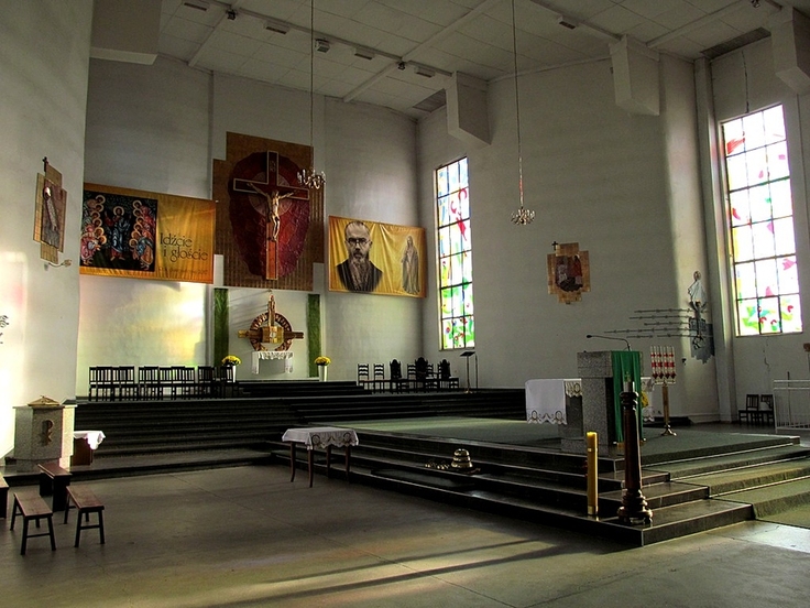W 1980 r., gdy wyznaczono teren pod budowę kościoła pw. Św. Maksymiliana Kolbego w Toruniu (osiedle Na Skarpie), przystąpiono do pierwszych prac budowlanych tymczasowej kaplicy. Już w grudniu erygowano parafię, ale dopiero w 1982 r. wmurowany został kamień węgielny w fundamenty przyszłego kościoła. W 1989 r. oddano do użytku (na razie) tzw. kościół dolny i tam początkowo odbywały się msze święte. Konsekracja świątyni nastąpiła 13 października 2002 r., a dokonał jej ówczesny Ordynariusz Diecezji Toruńskiej  ks. bp Andrzej Suski. Na zdjęciu: Prezbiterium w kościele pw. Św. Maksymiliana Kolbego w Toruniu.