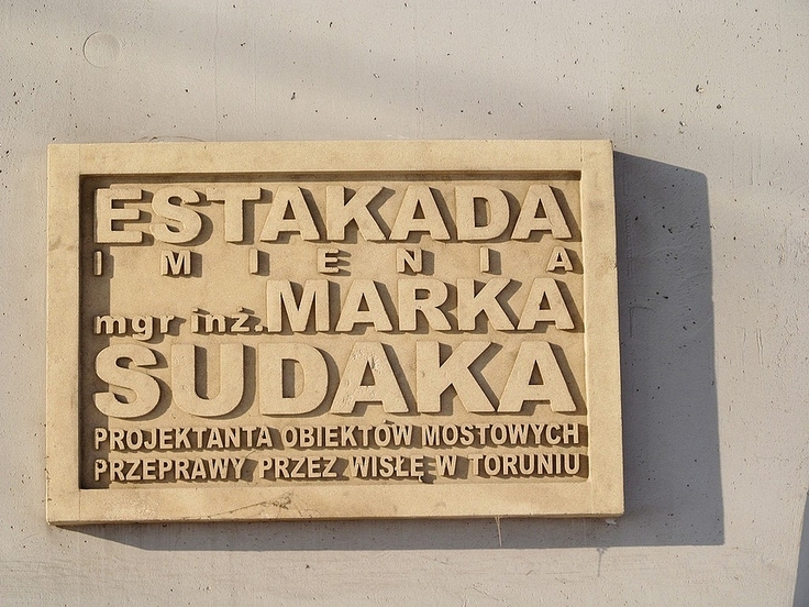 Gdy w Toruniu budowano most im. gen. Elżbiety Zawackiej, trzeba było przebudować fragmenty kilku ulic prowadzących na tę nową przeprawę drogową. W związku z tą przebudową powstała estakada, na filarze której zamocowano tablicę pamiątkową (na zdjęciu), upamiętniającą projektanta nowo wybudowanego mostu.