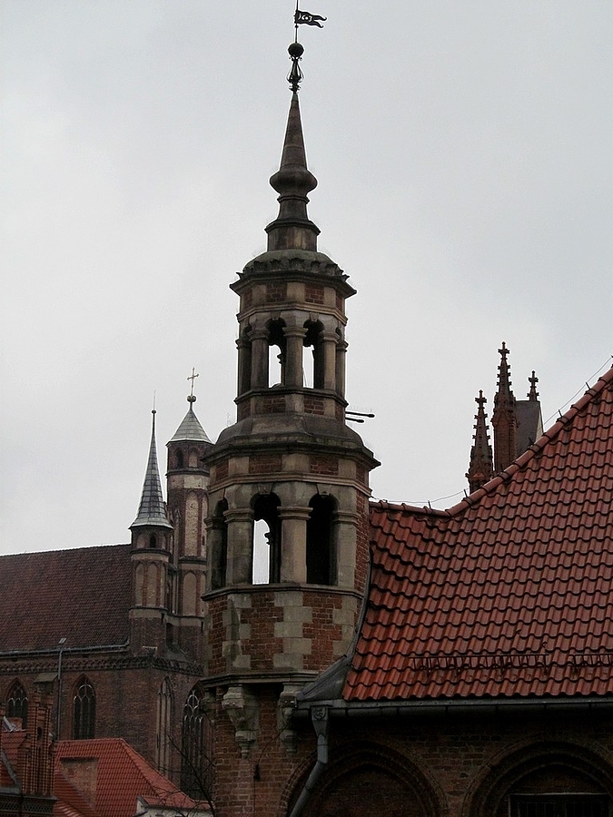 Tę południowo-zachodnią narożną wieżyczkę Ratusza Staromiejskiego w Toruniu można jedynie oglądać z zewnątrz. W głębi zdjęcia widoczny jest fragment kościoła pw. Wniebowzięcia Najświętszej Marii Panny.