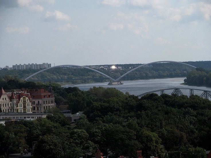 Te dwa białe skrzydła mostu należą do przeprawy drogowej we wschodniej części Torunia; most nosi imię gen. Elżbiety Zawackiej  torunianki, kurierki Komendy Głównej Armii Krajowej. Jako jedyna spośród 15 kandydatek, pomyślnie przeszła trening i służyła potem w szeregach cichociemnych. Była drugą kobietą w historii Wojska Polskiego, którą awansowano do stopnia generała brygady; odznaczona Orderem Orła Białego była matematyczką, profesorem nauk humanistycznych i specjalizowała się w historii najnowszej.
